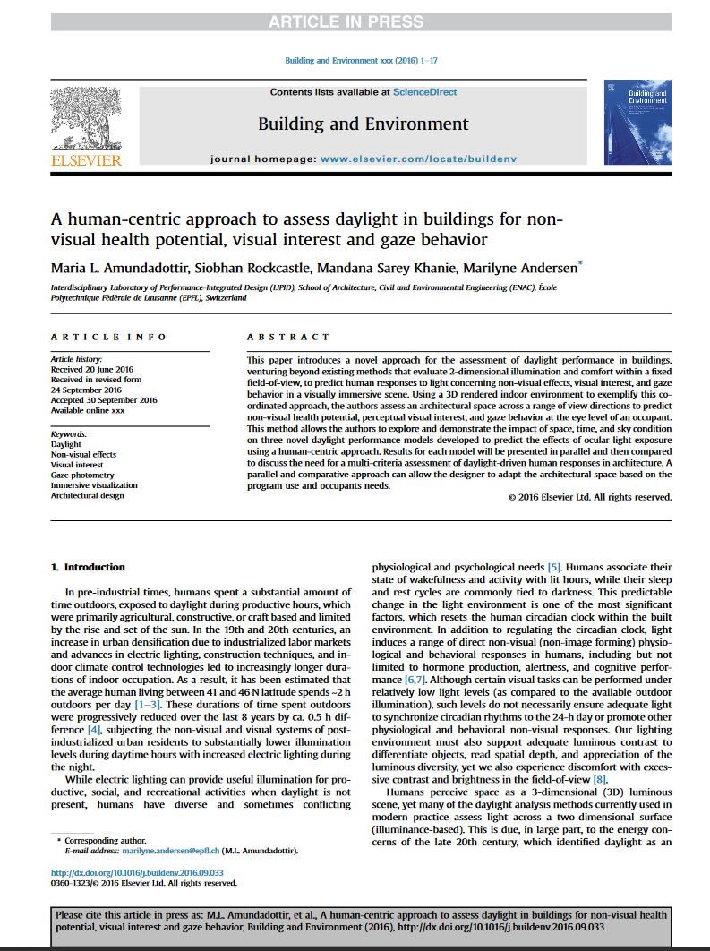 The LIPID lighting ladies (Maria Amundadottir, Siobhan Rockcastle, Mandana Sarey Khanie & Marilyne Andersen) have had a joint submission accepted to the daylighting special edition of Building & Environment. This paper introduces an exciting new approach to immersive human-centric performance simulation with novel metrics for predicting human health, visual interest, and gaze behavior. The accepted version of this article can be found online here.