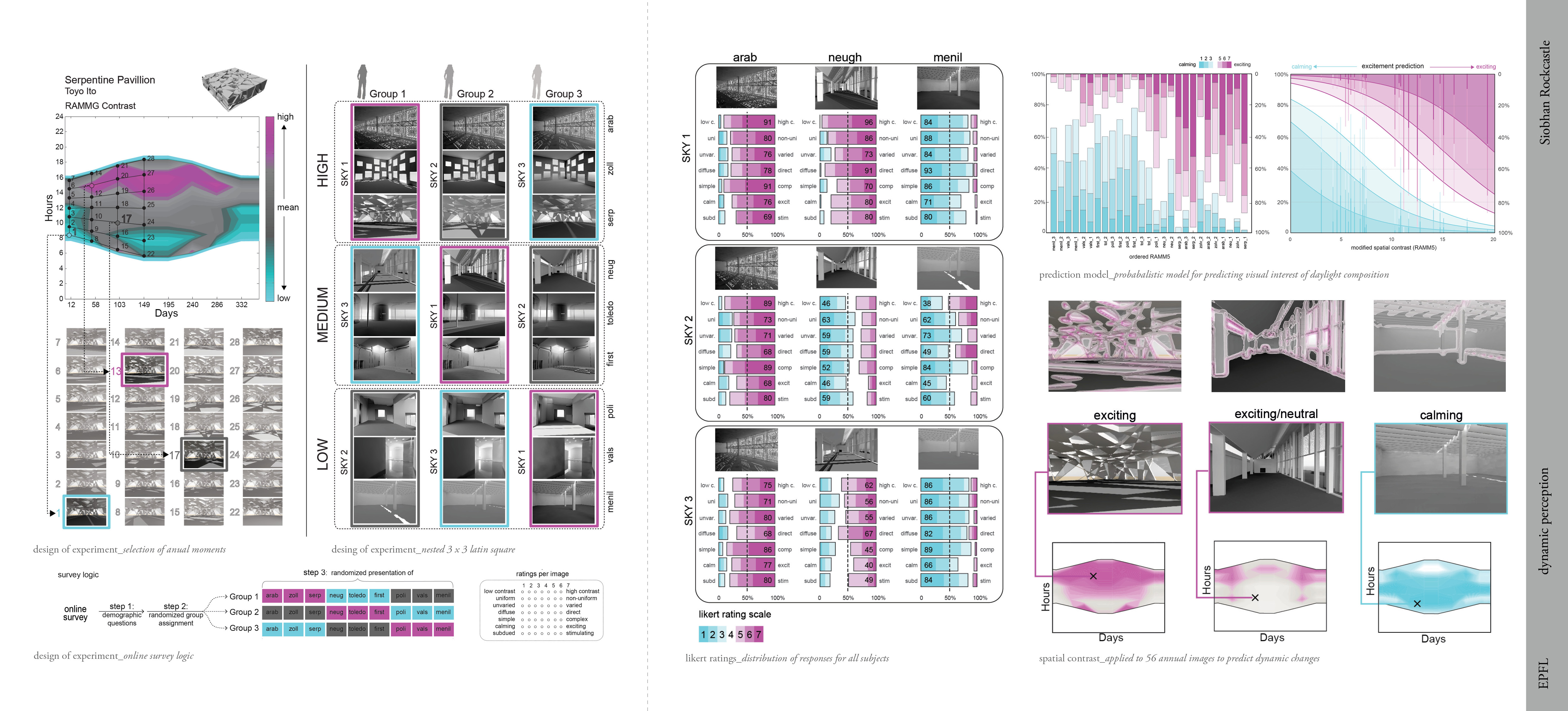 Daylit architecture is perceived as a dynamic luminous composition, yet existing performance metrics most often evaluate natural illumination for its ability to adequately illuminate a two-dimensional task surface while avoiding glare-based discomfort. This limited task-driven approach places a disproportionate emphasis on surface illumination and glare-based discomfort and ignores the likelihood that contrast can provide a positive impact on our visual perception. Existing studies have attempted to link subjective ratings of composition and preference to simple global contrast metrics without reaching a strong consensus. More robust metrics have been developed in computational graphics and vision research, but have not been applied to studies in qualitative lighting research. As daylight-driven visual effects in architecture are influenced by dynamic sky conditions, this research introduces an experimental method through which ratings of daylight composition in architectural renderings are then compared to existing contrast metrics across a series of annual moments. This research seeks to identify which quantitative metrics correlate to subject ratings of visual interest, and introduces a quantitative measure which can be used as a novel prediction model for characteristics of visual interest in dynamic renderings of daylit architecture.