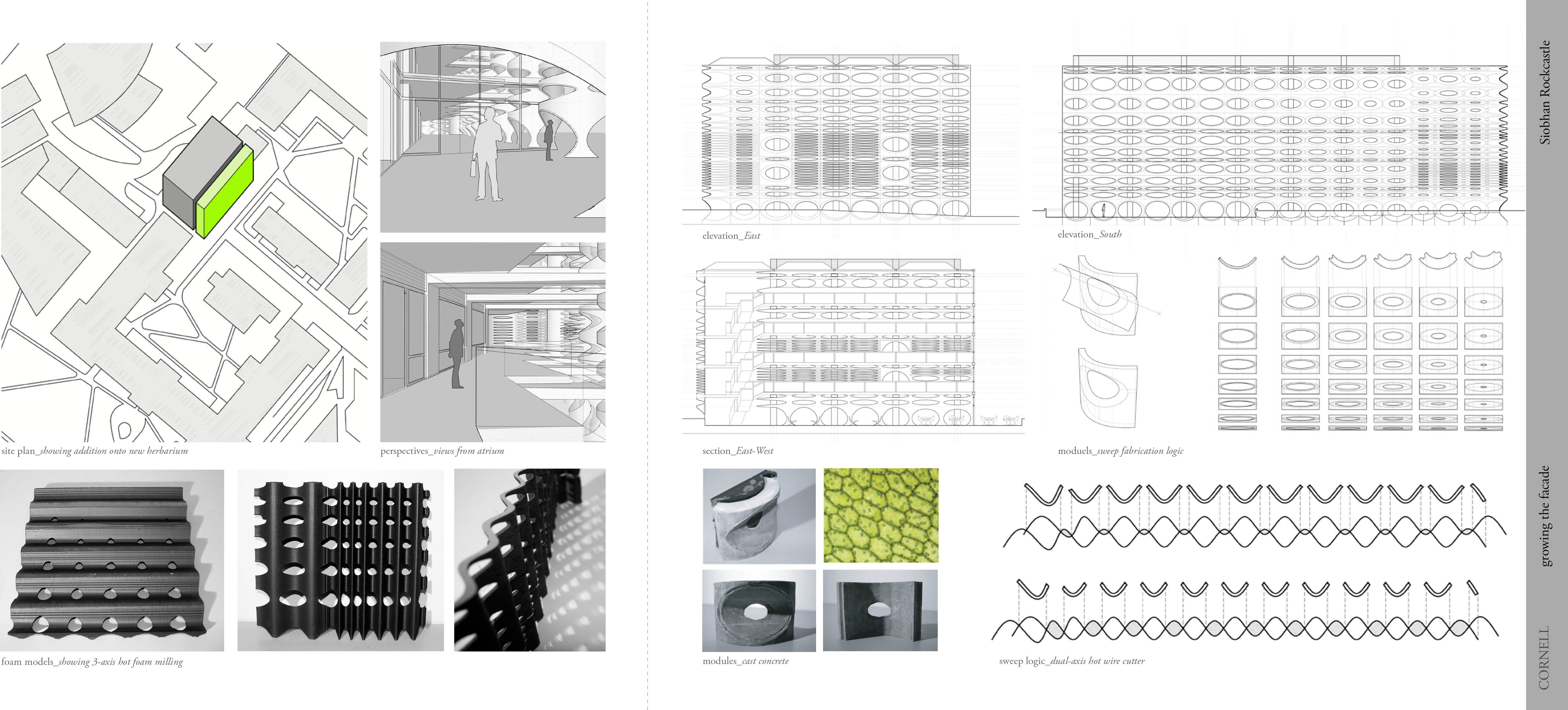 The Harvard Herbarium is home to one of the most expansive collections of pressed flowers and plant species in the world. It houses hundreds of thousands of specimens in light-sensitive and hermetically sealed black-boxes well as pressed books. The program for this project includes a renovation to the existing facility to accommodate additional archival space as well as an expanded library and digital media space. The studio had a secondary focus centered around the fabrication of concrete forms using a dual-axis digital foam cutter. Through a series of layered cutting techniques, I developed a modular system of undulating blocks that could be customized for porosity and structural load-baring capabilities. My project analyzed the porosity of light through organic tissue to propose a modular “cell wall” for the facade of the existing building. I was interested in comparing the porosity of cell structure and photosynthesis to early methods of photography that involved inverting images from positive to negative. The archival procedures in a Herbarium are critical to the programming of its internal spaces. The specimens, once documented and pressed, must be kept away from any external influences such as light and heat.. The library and viewing platforms, however, must provide adequate daylight for the occupant. As such, my project investigates a new facade that programs light through the density and aperture of modular cells, stratifying internal programs and external effects.
