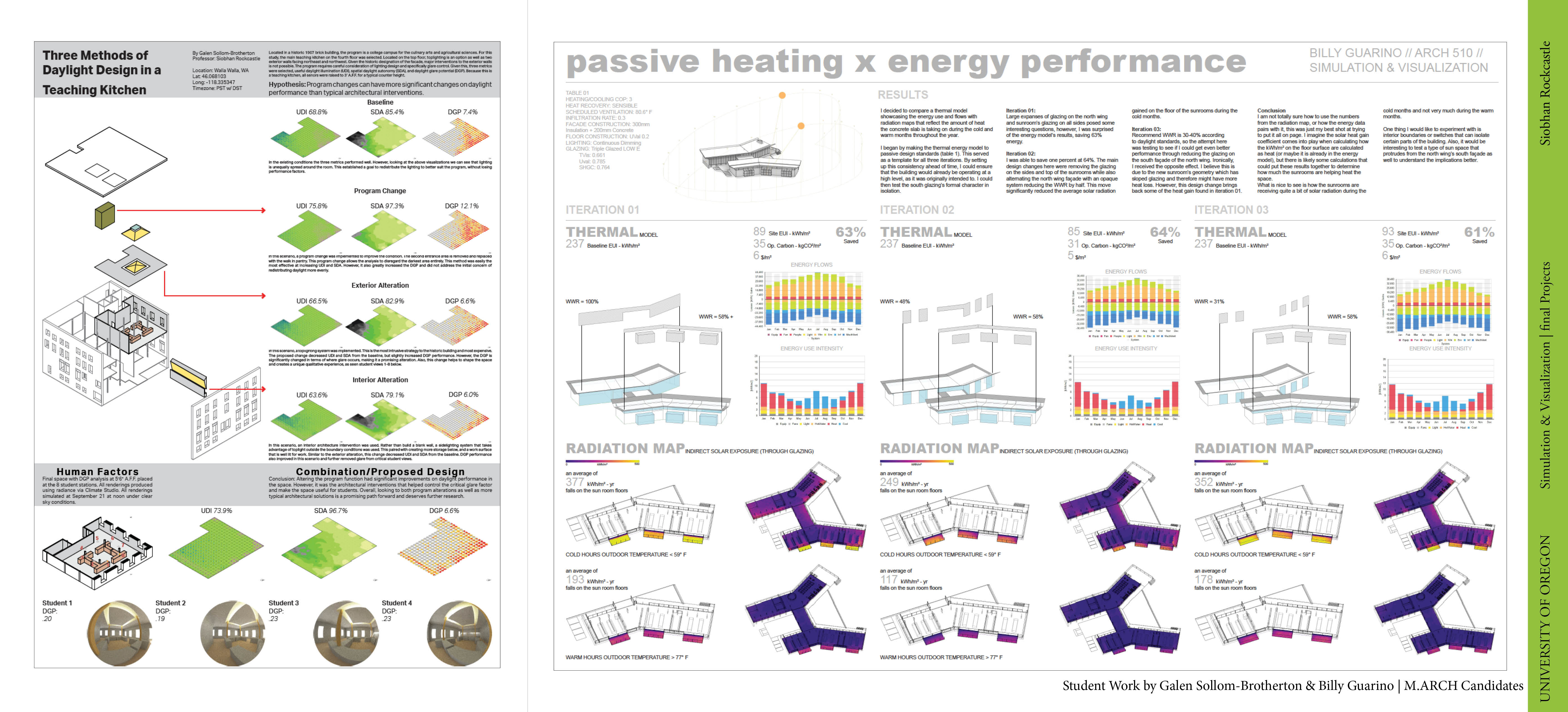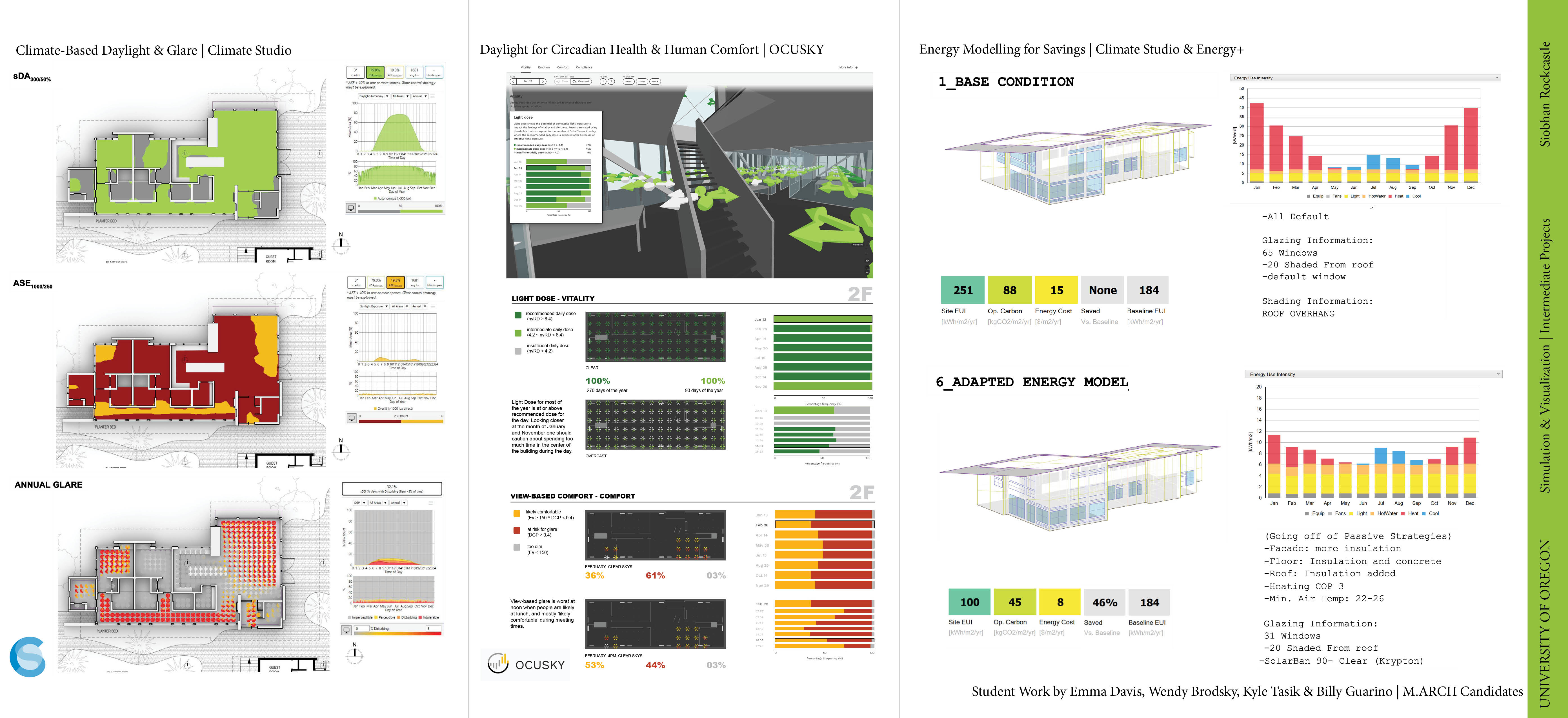 In this course, students explore the use of simulation tools to build the skills necessary to evaluate the performance of a building for daylight, electric light, thermal comfort, and energy. The first 7 weeks of the term include a series of workshops and short assignments in Climate Studio, Grasshopper, Oculight, Enscape/Lumion, and Twinmotion. The world of building simulation is large, covering a broad range of different tools, applications, and competencies. This course exposes students to both mainstream and emerging tools, with a focus on user-friendly workflows that will help them hit the ground running. The first series of workshops and assignments use Climate Studio and Grasshopper to provide an intuitive introduction to lighting and energy simulation. Students learn how to take a base rhino model and execute a series of analyses and interventions to measure and improve its environmental performance. Students are also exposed to an emerging tool called Oculight, which is used to run cloud-based simulations that evaluate circadian health and visual comfort. Finally, students are exposed to real-time rendering software to generate immersive renderings for use in VR and animation. In addition to the workshop sessions, this course is supported by a number of expert guest speakers who will offer workshops on their research, tool development, and use of simulation in professional practice. The end of the term culminates in a final project; proposed, developed, and executed using students’ studio project (past or present) and an in-depth analysis provided by one of the tools introduced over the term.